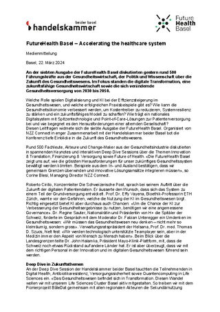 Rund 500 Fachleute, Akteure und Change-Maker aus der Gesundheitsindustrie diskutierten in spannenden Keynotes und interaktiven Deep Dive Sessions über die Themen Innovation & Translation, Finanzierung & Versorgung sowie Future of Health. «Die FutureHealth Basel zeigt uns auf, wie die grössten Herausforderungen für unser zukünftiges Gesundheitssystem bewältigt werden könnten. Beispiele aus dem In- und Ausland bestätigen, dass wir gemeinsam Grenzen überwinden und innovative Lösungsansätze integrieren müssen», so Corine Blesi, Managing Director NZZ Connect.