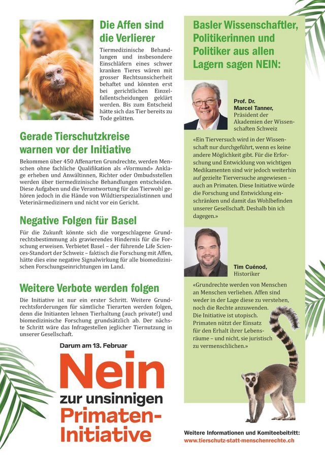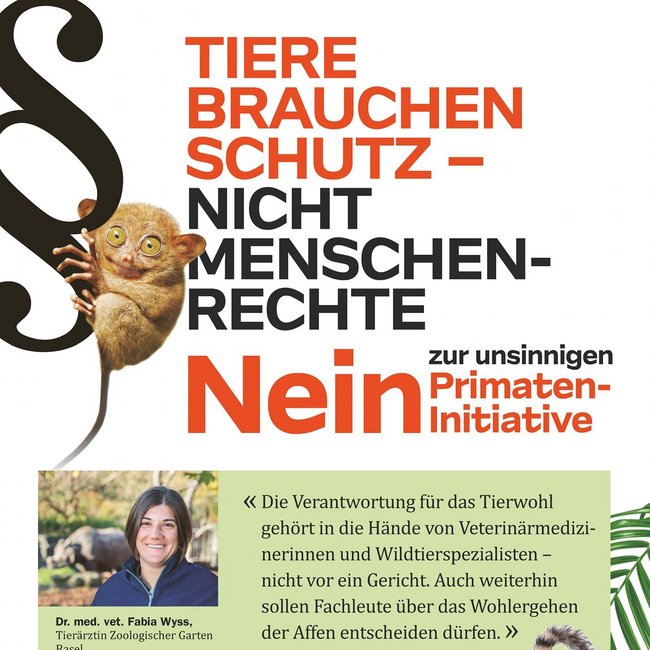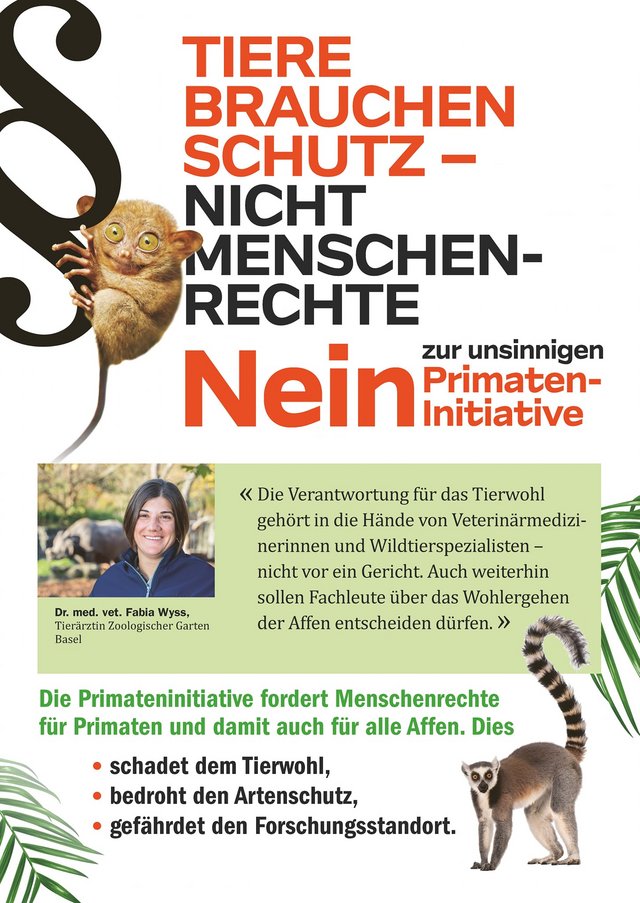 Ein breit abgestütztes Komitee «Tierschutz statt Menschenrechte» mit Tierexpertinnen und -Experten aus Zoo und Tierarztvereinigung, Forschenden, Wirtschaftsvertretenden sowie Politikerinnen und Politiker von links bis rechts setzt sich gegen die Primateninitiative ein. Das Tierwohl gehört in die Hände von Tierfachpersonen und nicht in diejenigen von Gerichten. Zudem hat diese extreme Initiative eine negative Signalwirkung für die ganze Schweiz und den Forschungsstandort Basel.